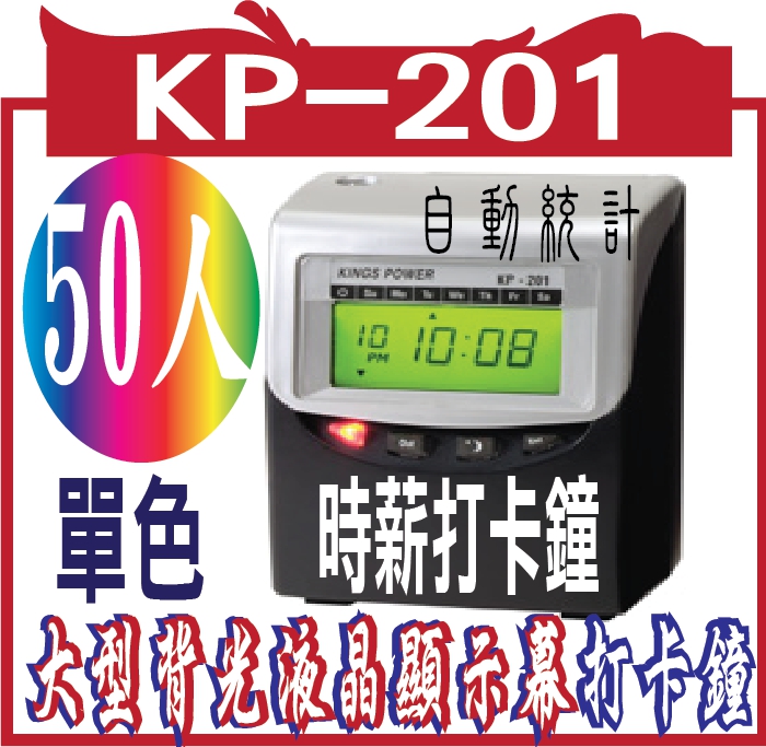 KP-201 51544加碼送【附100張 1至100號 條碼卡紙。】時薪打卡鐘 自動統計功能 時薪打卡鐘 Kings Power KP-201 大型背光液晶顯示幕 5,900