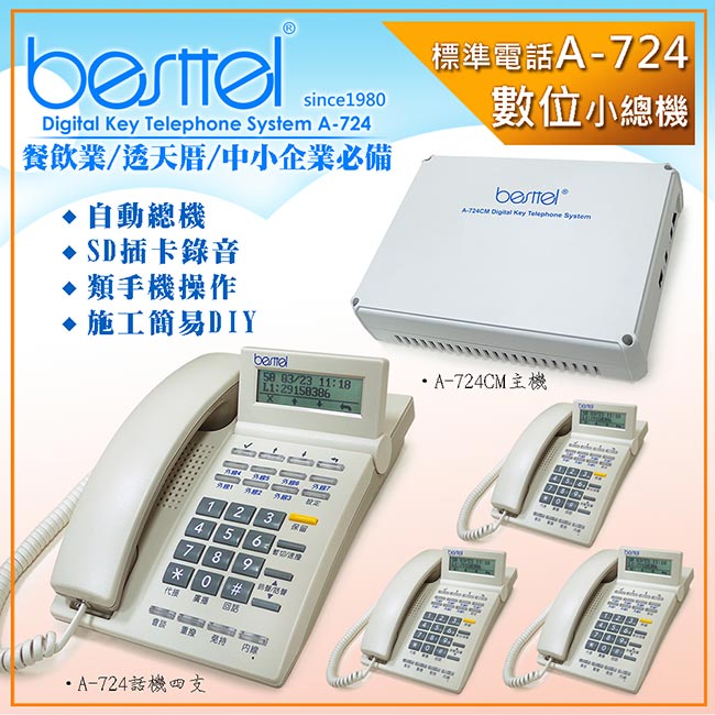 besttel 錄音型 數位系統總機 A-724 ◆ A-724CM主機 + A-724數位電話*4 69613besttel 錄音型 數位系統總機 A-724 ◆ A-724CM主機 + A-724數位電話*4 17,600