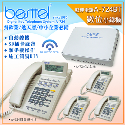 besttel 錄音 + 藍芽型 數位系統總機 A-724BT69612besttel 錄音 + 藍芽型 數位系統總機 A-724BT A-724CM主機 + A-724BT藍芽電話*4 19,600