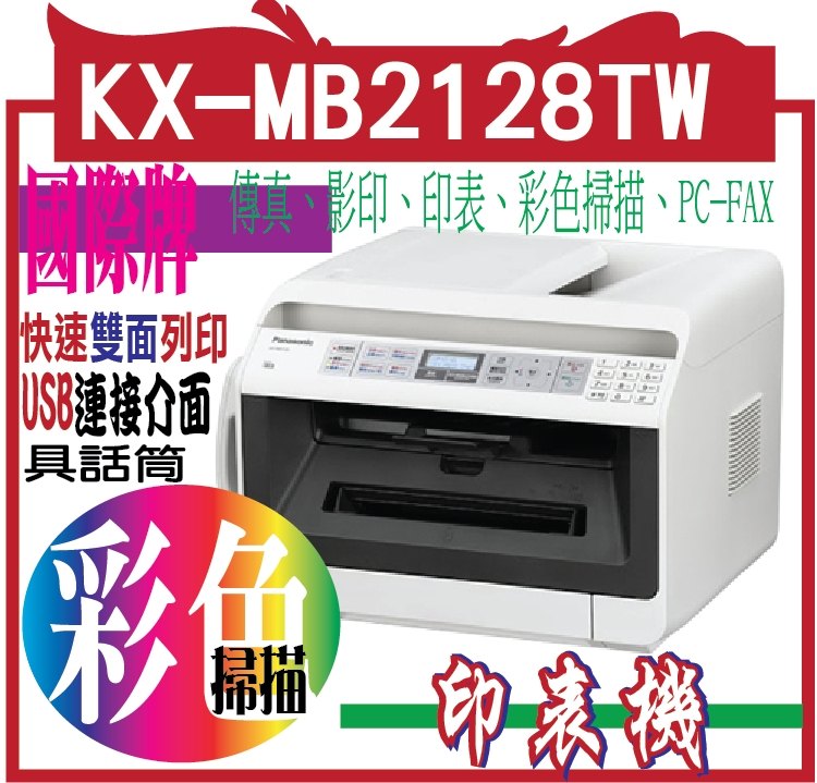 KX-MB2128TW##USB2.0##62072KX-MB2128TW A4,ADF 35張,3秒機,26PPM,64MB,證件影印,具話筒雙面列印,手機(平板)遠端/雲端列印,250張卡匣+單張手送平台式,傳真、影印、印表、彩色掃描、PC-FAXUSB2.0 7,999