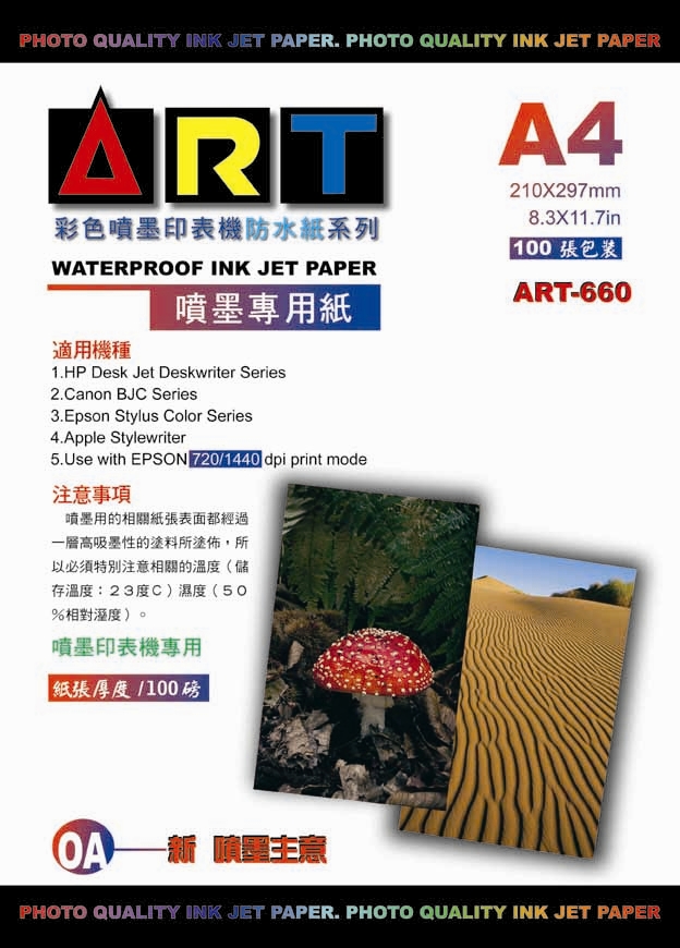 ART-66033093噴墨防水紙 ( 720~5760DPI ) ART-660 防水噴墨專用紙 A4 / 100 磅 100張 / 包 120