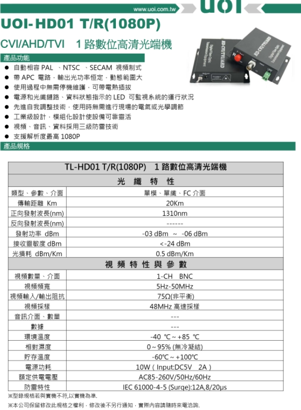 UOI-HD01 T/R(1080P) CVI/AHD/TVI 1路數位高清光端機79908UOI-HD01 T/R(1080P) CVI/AHD/TVI 1路數位高清光端機 call 53 1021家優良廠商出貨