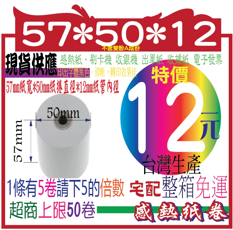 ...POS熱感應紙捲 57*50*12 熱感紙卷 感熱紙卷 (不含雙酚A成份)@$200卷超值組合超值組合 好朋友分享匯款價79047...POS熱感應紙捲 57*50*12 熱感紙卷 感熱紙卷 (不含雙酚A成份)@$200卷大包裝組合超值組合 好朋友分享匯款價 2,873