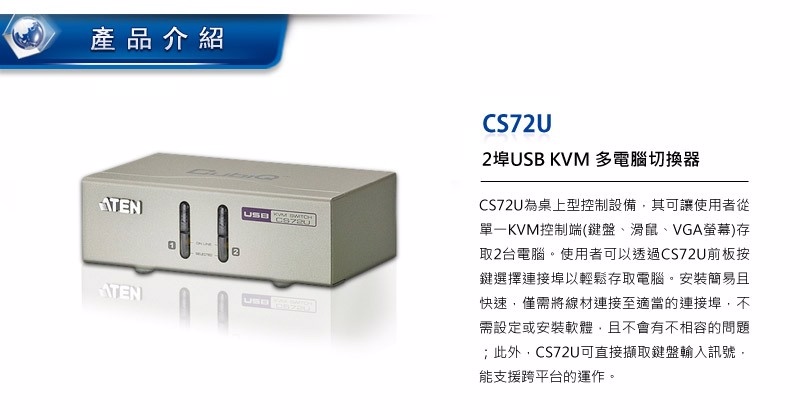 CS72U為桌上型控制設備,其可讓使用者從單一KVM控制端(鍵盤、滑鼠、VGA螢幕)存取2台電腦。