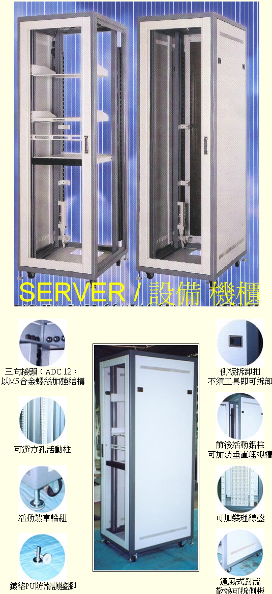 鋁框式通風式側板組,採用外觀無螺絲,拆卸容易不須工具,鋁框式可拆式側板,上下各有通風導孔,產生空氣對流,交換冷、熱空氣,上蓋板加裝散熱風扇組,加強排除熱空氣,吸入冷空氣,保持機架內工作溫度,保護電腦設備不過熱,排除過熱產生的故障,側版拆卸後,可多台串聯成一體,並可固定於地板上。