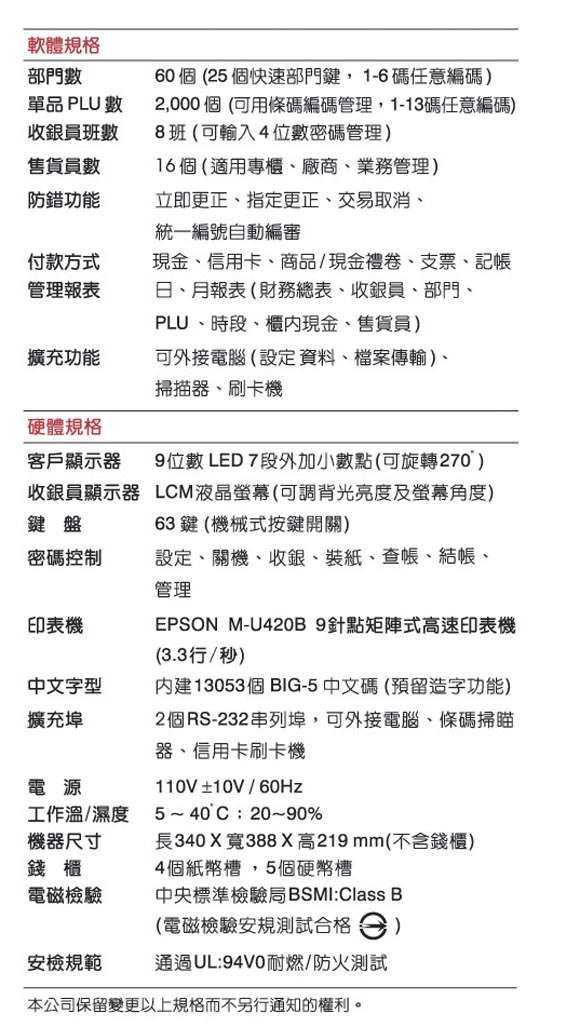 現金、信用卡、商品 / 現金禮卷、支票、記帳日、月報表 ( 財務總表、收銀機、部門、 PLU 、時段、櫃內現金、售貨員 )