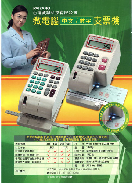 Paiyang支票機-->Paiyang P-668支票機商品查詢代碼:QK40740