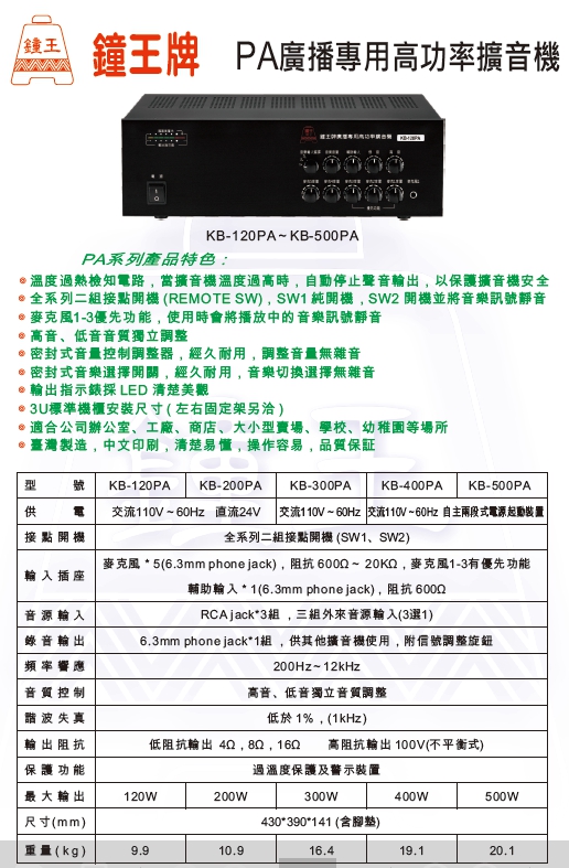 鐘王PA擴音系統-->KB-120PA+SW商品查詢代碼:QK42736
