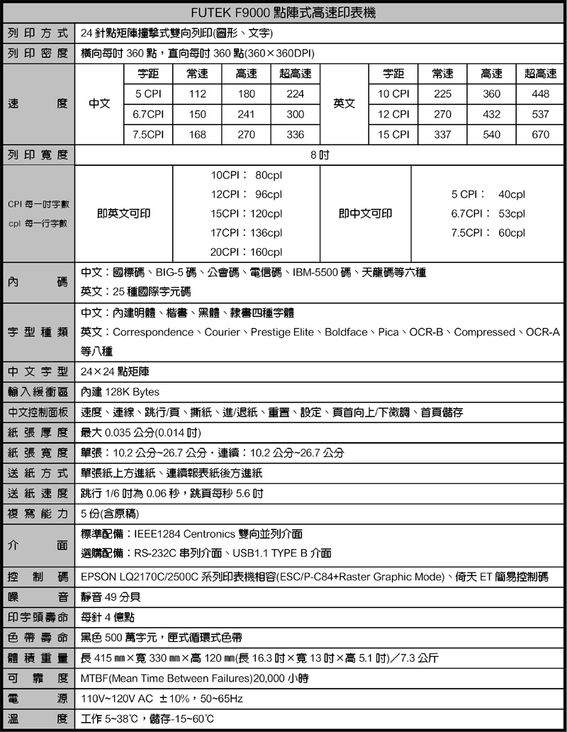 F9000 FUTEK 超高速80行平台點陣印表機