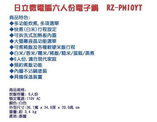 專案限量日立六人份微電腦電子鍋 RZ-PM10YT