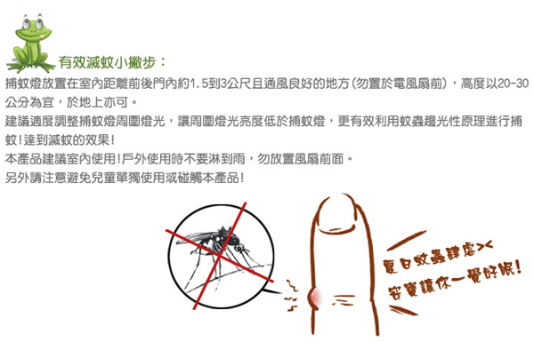 l 利用捕蟲燈管引誘蚊子、蒼蠅、飛蛾、果蠅、白蟻等昆蟲進入滅蚊器內,然後以直流電觸殺。