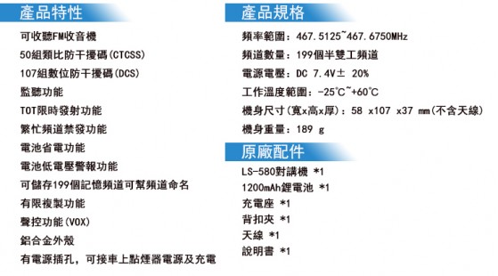 : 富洋無線電對講機-->LISHENG LS-580 商品查詢代碼:QK51441