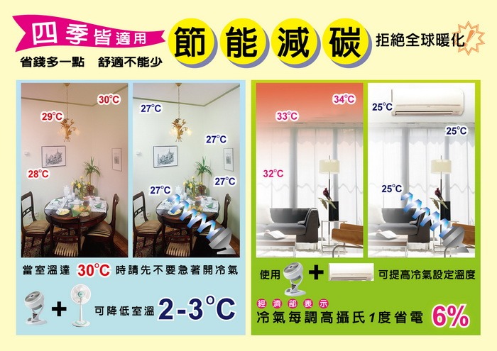 炎炎夏日,毒辣的陽光讓一切都變的麻煩,室內更是悶的嚇人,想開冷氣但又怕電費的無情,循環扇應而就誕生啦~,循環扇擁有超強漩渦是氣流,能迅速循環室內空氣,使各處皆涼快,如果配合冷氣使用更能突顯效果,總之,能又涼快又省電啦~