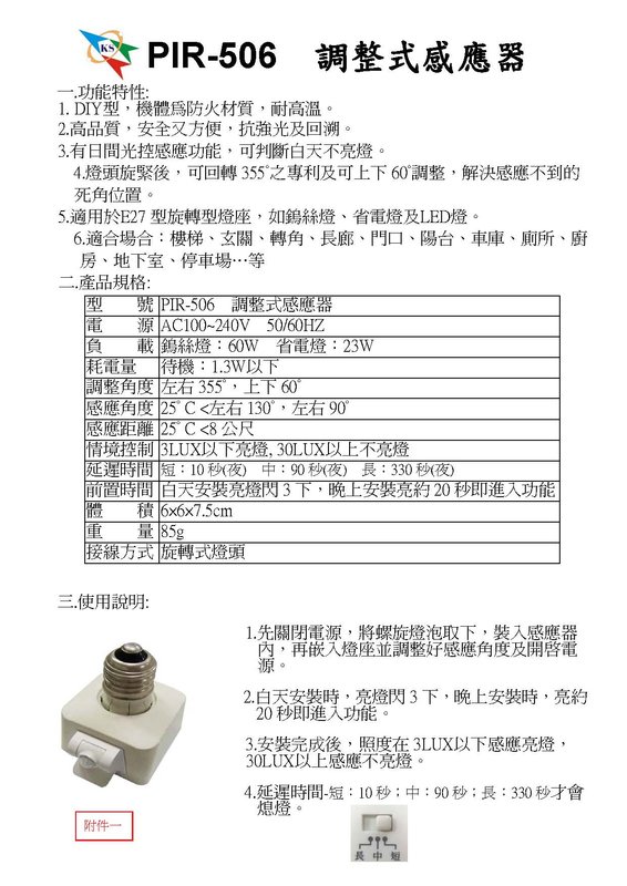 型 號 PIR-506 調整式感應器電 源 AC100~240V 50/60HZ 負 載鎢絲燈:60W 省電燈:23W 耗電量待機:1.3W以下情境控制 3LUX以下亮燈, 30LUX以上不亮燈延遲時間短:10秒(夜) 中:90秒(夜) 長:330秒(夜) 前置時間白天安裝亮燈閃3下,晚上安裝亮約20秒即進入功能體 積 6×6×7.5cm 重 量 85g 接線方式旋轉式燈頭
