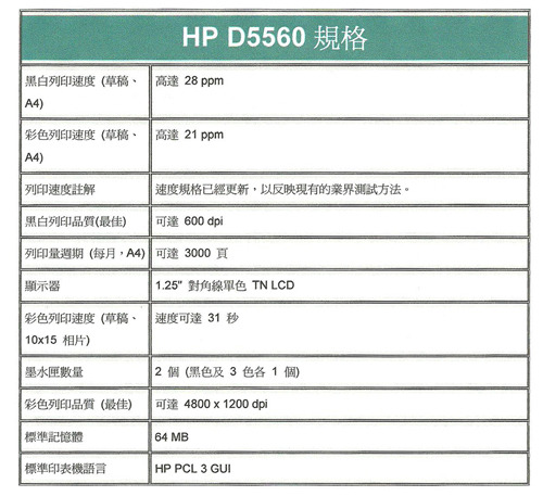 印表機型號【HP D5560】。外觀及產品規格如下: