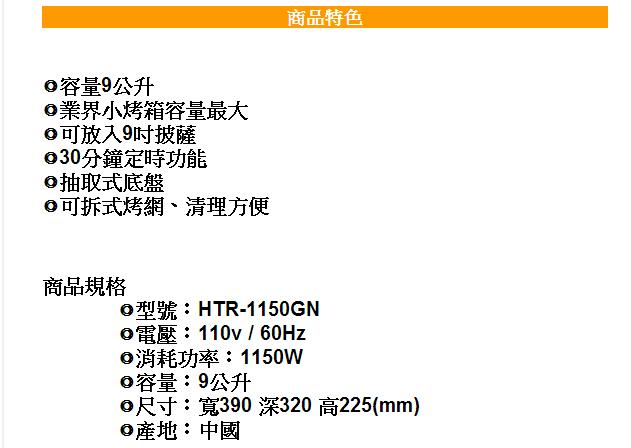 電鍋-->東芝 9公升電烤箱 [HTR-1150GN]商品查詢代碼:QK56601