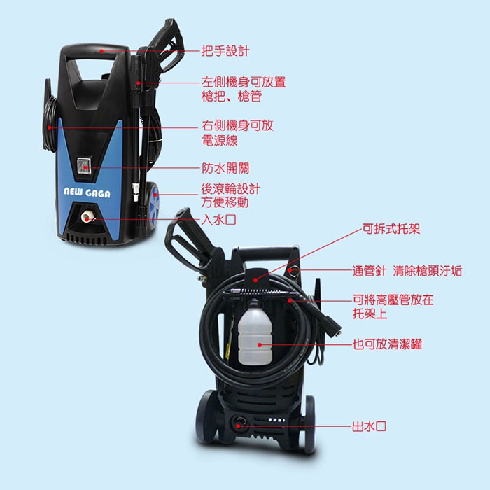 • 右側及後面機身可放高壓管、電源線及清潔罐
