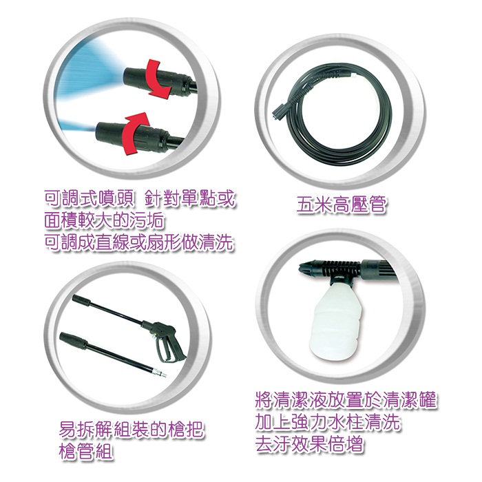 105Bar擁有超強水柱讓您輕鬆沖掉居家陽台上的砂塵,空氣污染沉澱物,清洗花園青苔輕而易舉,紗窗灰塵戶外庭園霉垢一掃而盡.幫您節省清洗時間。任何角落都不放過,省水省電讓居家環境乾乾淨淨。