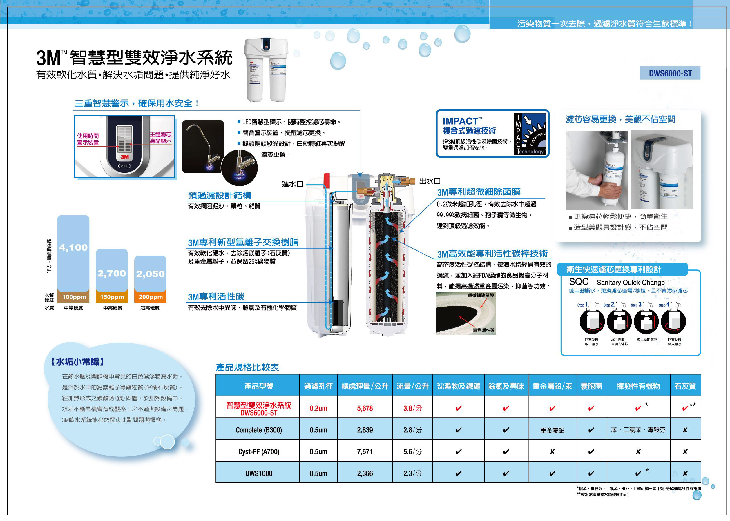 3M DWS6000-st雙效淨水軟水系統3M 智慧型雙效淨水系統DWS6000-ST3M在水質淨化的專業領域上,除整合CUNO百年淨水技術,為市場提供值得信賴的淨水過濾服務。3M已成功地將客製化的水質濾淨服務,廣泛映用於電子晶圓的超純水、生物醫療的製藥過濾、建築安全淨水規劃設計,以及大型連鎖餐飲業的飲品淨水。這些成就在在顯示3M所擁有的百項專利淨水技術,與專業服務以獲得市場的青睞與肯定。