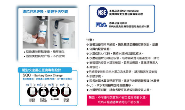 此雙效軟水生飲系統,第一道濾芯以新型氫離子交換樹脂,來交換水中 硬度離子以軟化水質、氫離子屬陽離子亦可去除水中帶正電的重金屬污 染物。 第二道IMPACT技術濾芯,能同時去除水中物理性、化學性與生物型污染 物,使飲水純淨好喝,能符合飲用水標準。