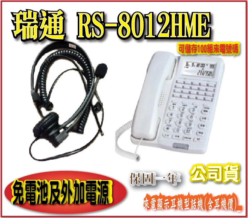 電子交換機話機-->瑞通 RS-8012HME 來電顯示耳機型話機(含耳機價)_20組記憶鍵_鈴聲可關閉_乳白色商品查詢代碼:QK60450