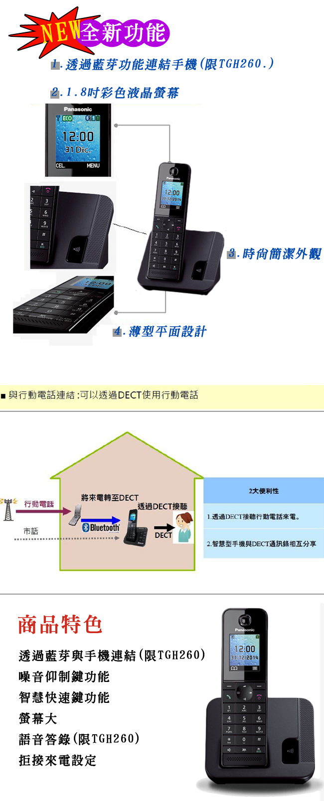 DECT數位式無線電話-->DECT 數位答錄大字鍵無線電話 TGH-260升級旗鑑款商品查詢代碼:QK60646