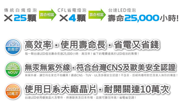 ¨Ï¥Î°ê»Ú¤j¼tCREE/NICHIA´¹¤ù ¡½¨Ï¥Î¤é¨tªø¹Ø©R¹q®e¡A¹Ø©Rªø¹F25,000¤p®É¥H¤W¡C¬O¶Ç²Î¥Õ¿K¿Oªwªº25¿¡FCFL¬Ù¹q¿Oªwªº4¿¡I ¡½²£«~³]p³q¹L100,000¦¸¶}ÃöÂI¿O´ú¸Õ ¡½³q¹L¥x¹F¹q¤lÄYVÀËÅç¼Ð·Ç¡A¨C¤@ӨϥΪº¹s¥ó§¡³q¹L¥[³t¦Ñ¤Æ«H¿à©Ê´ú¸Õ¡A¥H½T«O²£«~¨Ï¥Î¹Ø©R