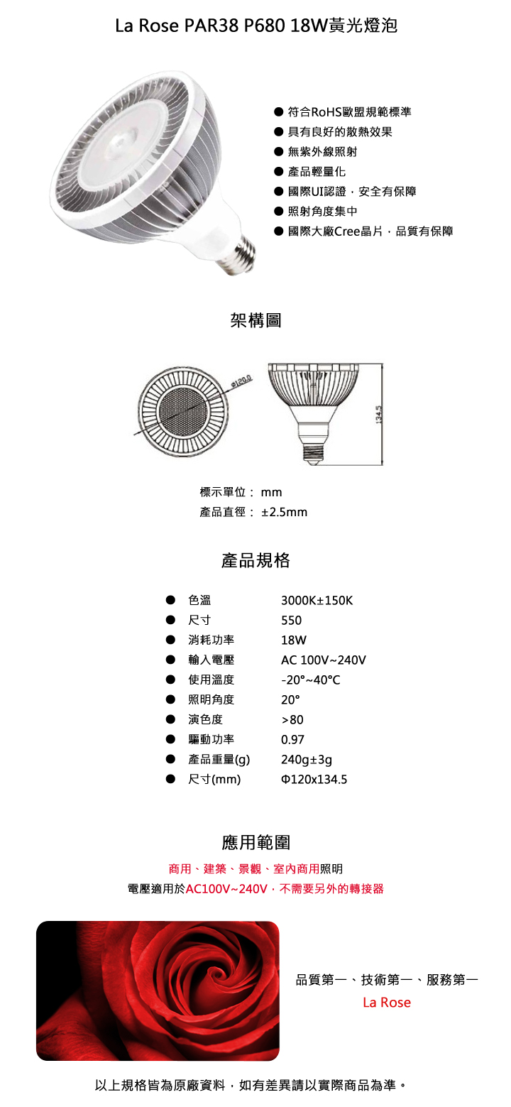 型號:La Rose PAR38 P680 18W黃光燈泡