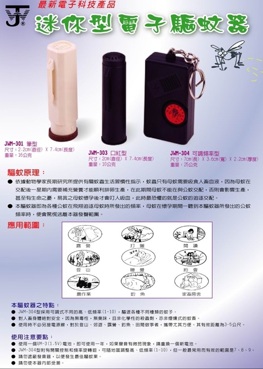 依據 動 物 學 家 長 期 研 究 所 提 供 有 關 蚊 蟲 生 活 習 性 指 示 , 蚊 蟲 祇 有 母 蚊 需 要 吸 食 人 畜 血 液 , 因 為 母 蚊 在 交 配 後 一 星 期 內 需 要 補 充 營 養 才 能 順 利 排 卵 生 產 , 在 此 期 間 母 蚊 不 能 再 與 公 蚊 交 配 , 否 則 會 影 響 生 產 , 甚 至 有 生 命 之 憂 , 易 言 之 母 蚊 懷 孕 後 才 會 叮 人 吸 血 , 此 時 最 恐 懼 的 就 是 公 蚊 的 追 逐 交 配 。 本 驅 蚊 器 即 為 各 種 公 蚊 在 飛 翔 追 逐 母 蚊 時 所 發 出 的 頻 率 , 母 蚊 在 懷 孕 期 間 一 聽 到 本 驅 蚊 器 所 發 出 的 公 蚊 頻 率 時 , 便 會 驚 慌 逃 離 本 器 發 聲 範 圍 有效範圍:1-3公尺
