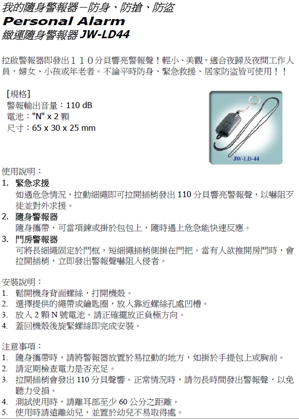 注意事項: 1.隨身攜帶時,請將警報器放置於易拉動的地方,如掛於手提包上或胸前。