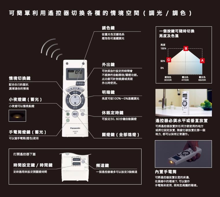 ■功能:無線遙控LED無段調光、無段調色、時間顯示、外出模式(設定開關燈)、延遲闗燈、照明燈