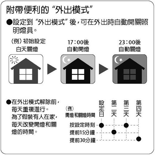 ☆ 多功能無線遙控器:時間顯示、外出模式 (設定開燈關燈時間)、延遲闗燈