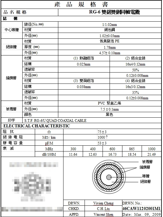 線材-->5C2V RG-6 100% 3000MHZ 雙網雙鋁隔離線商品查詢代碼:QK63403