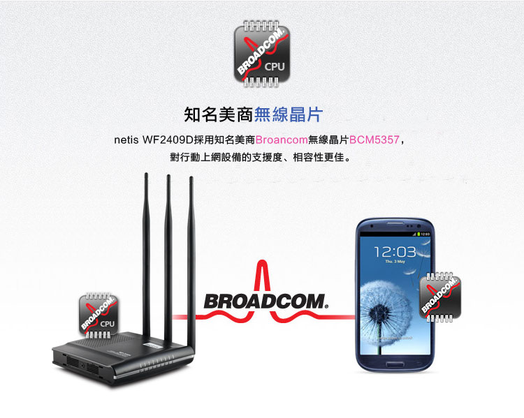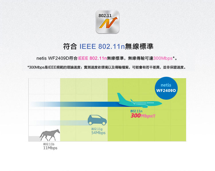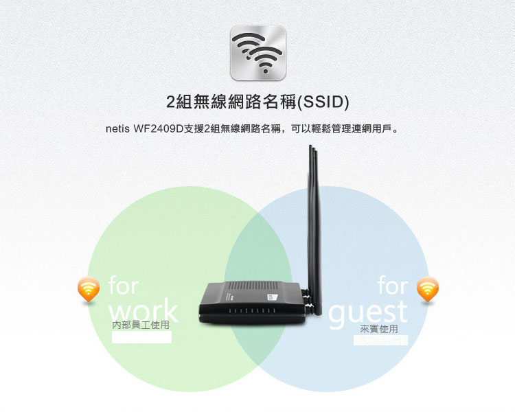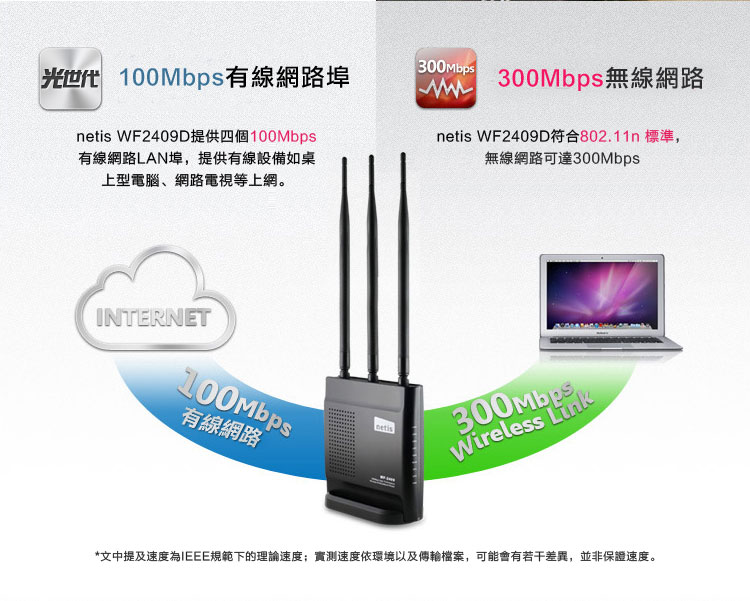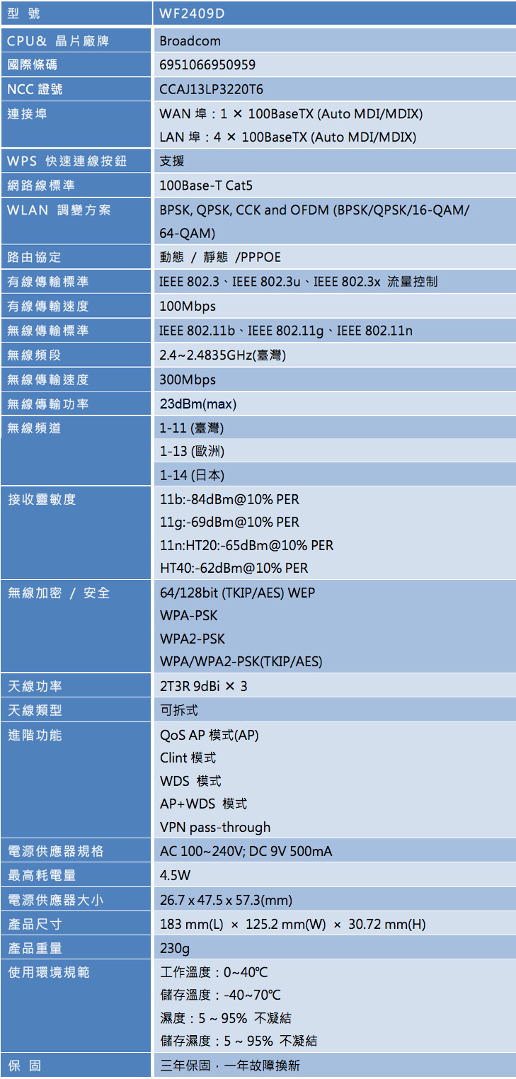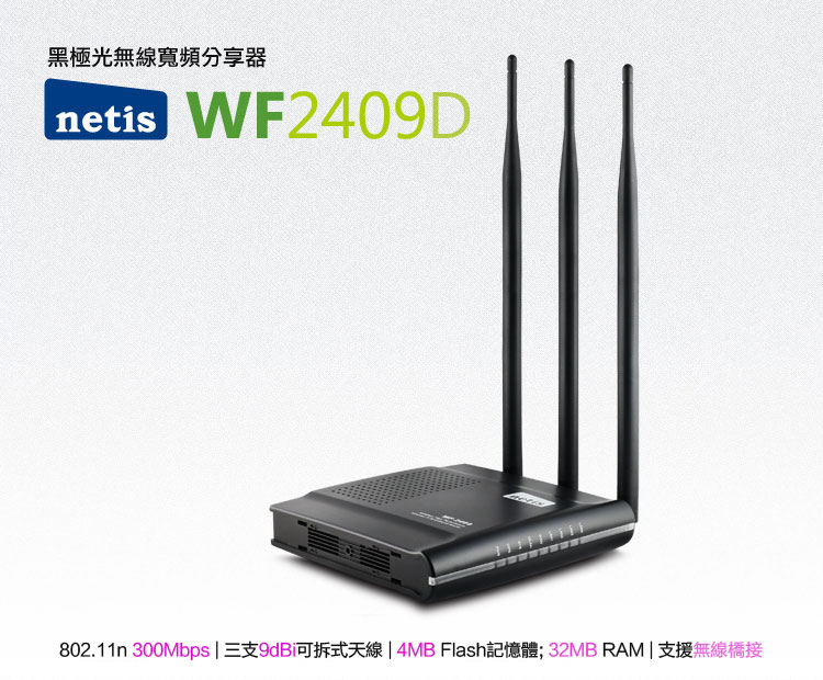 WF2409D 專為小型辦公室、公寓、居家用戶量身打造。符合 802.11n 標準,無線傳輸效能最高可達300Mbps。搭配三根可拆式9dBi大天線,無線訊號再強化、無線靈敏度更提升、無線範圍最寬廣,免除網路死角的窘境。採用創新的電鍍金屬薄層嵌膜散熱技術,穩定耐用效果佳