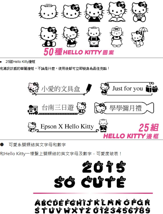 2015年的可愛巨作─Epson為Kitty迷量身打造的標籤機,帶你一起進入夢幻的粉紅世界!機身外型輕巧粉嫩,內建多款專屬圖案、邊框與符號,還有繽紛的標籤帶,隨時隨地陪伴你,讓生活因Hello Kitty而美好。
