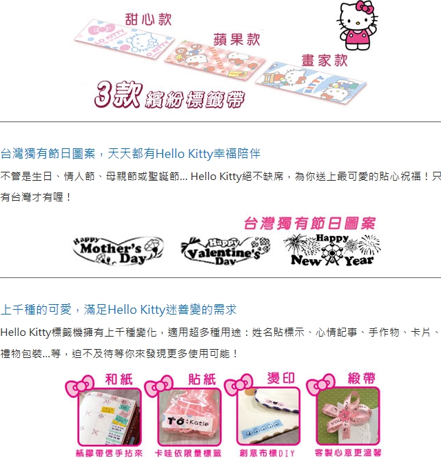 Hello Kitty標籤機擁有上千種變化,適用超多種用途:姓名貼標示、心情記事、手作物、卡片、禮物包裝…等,迫不及待等你來發現更多使用可能!