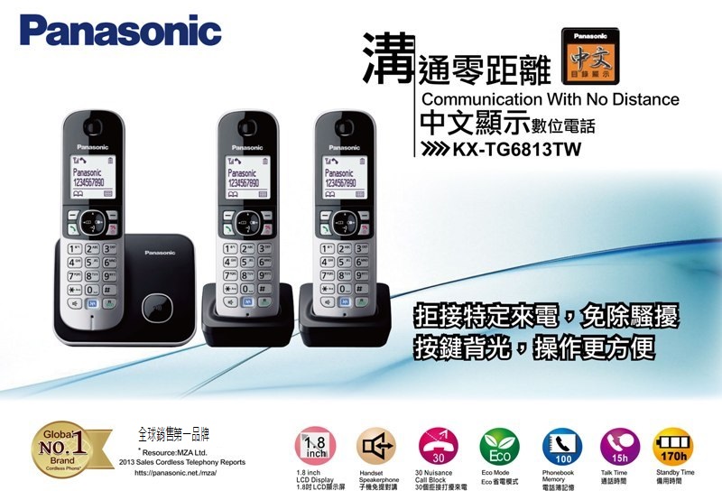 專案限量Panasonic中文顯示三機數位無線電話(KX-TG6813TW)