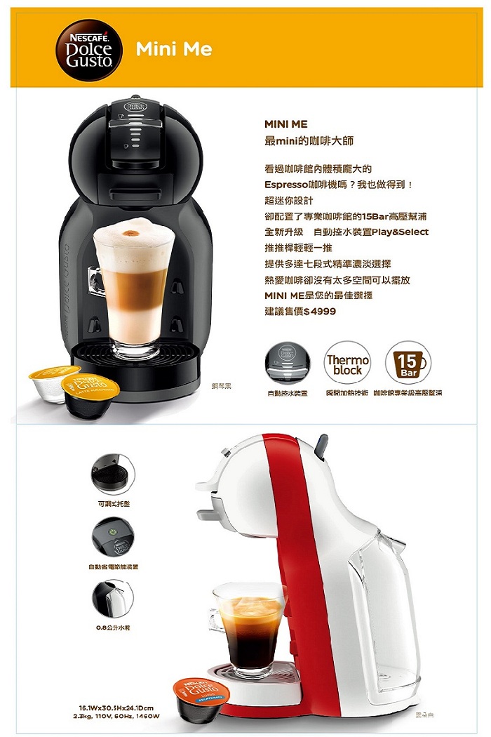 專案限量 雀巢咖啡-Mini me 雲朵白 +18盒精選膠囊禮盒 七段式全自動控水功能 輕鬆調整飲品濃淡 ■ 咖啡館級15bar專業高壓幫浦 萃取香醇濃郁的咖啡脂 ■ 瞬間加熱技術,5秒將水加熱至95度 ■ 可調式托盤,試用多種大小咖啡杯 ■ 自動省電節能裝置 ■ 0.8 公升水箱 ■ 超過20種豐富口味:義式濃縮咖啡、 美式咖啡、花式咖啡或者巧克力與茶飲 各種口味滿足您的味蕾!
