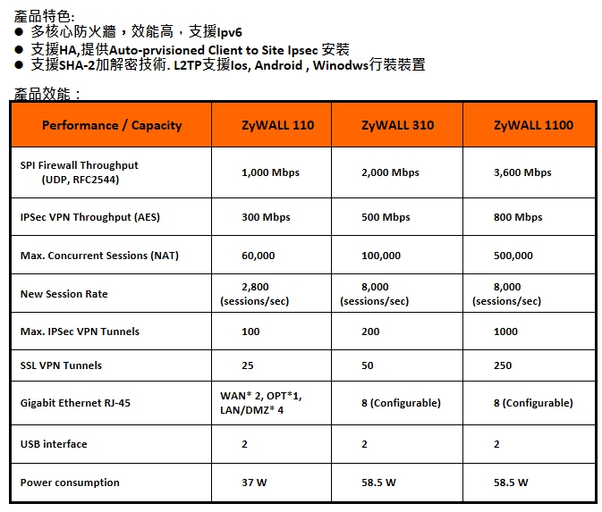 專案限量ZyXEL ZyWALL 310多核心CPU提供高達6Gbps防火牆效能與800Mbps VPN吞吐量 ►新系列防火牆效能提升15倍,VPN效能提升4.4倍 ►SHA-2 加密提供更安全的 VPN連接 ►雙WAN 埠故障切換(failover)與復原(fallback) 支援VPN高可用
