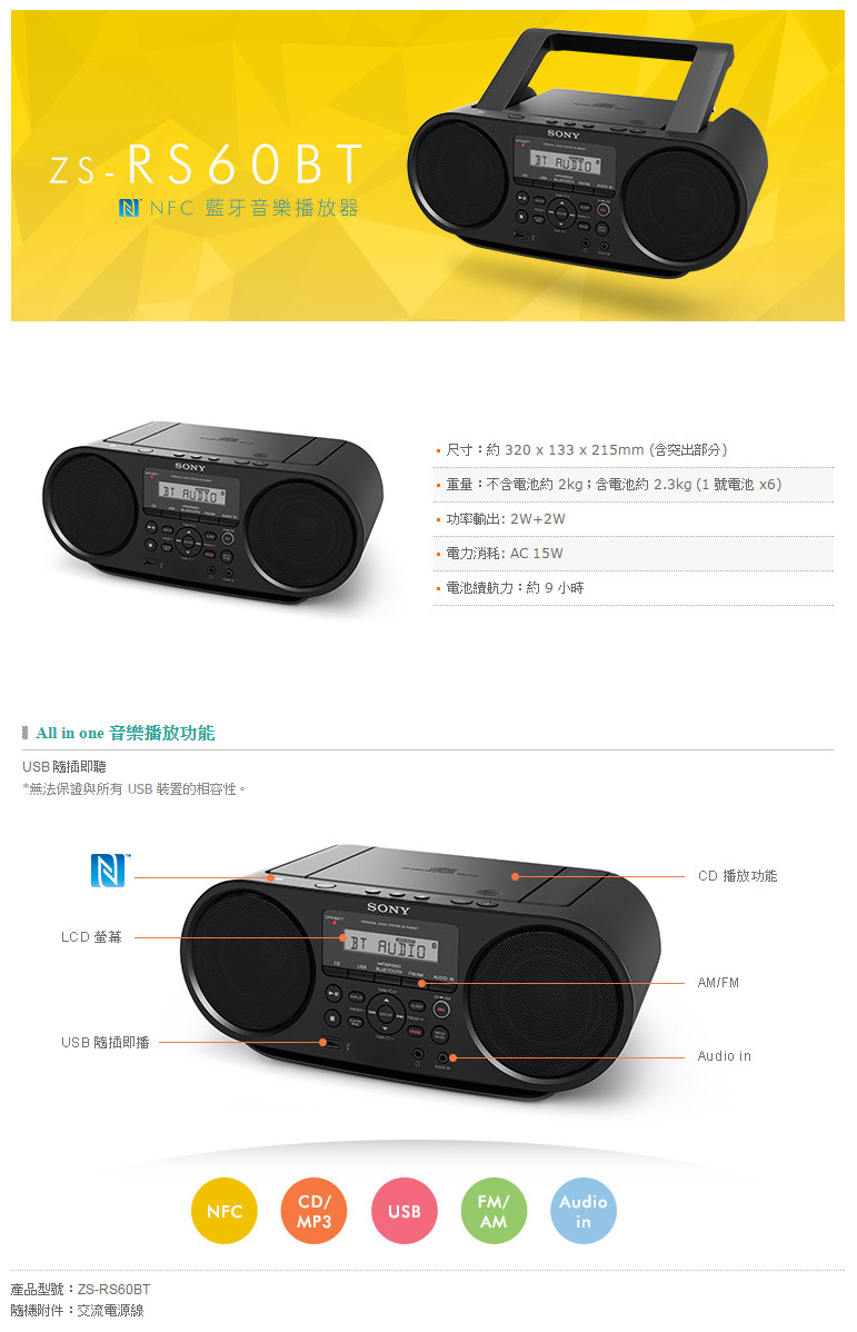 | 型號:SONY NFC 重低音藍牙喇叭 ZS-RS60BT 供貨狀況: | |||||||||||||