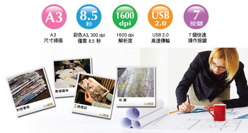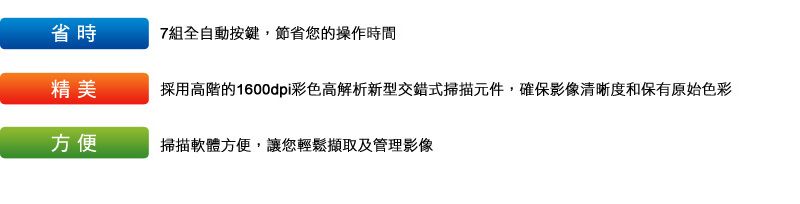 OpticPro A320採用1600dpi彩色高解析新型交錯式(Stagger CCD)掃描元件,掃描範圍達304.8mm x 431.8mm。對於需要掃描如大型地圖、工程藍圖、報章雜誌或彩色型錄的您來說,足可符合您的需求 |