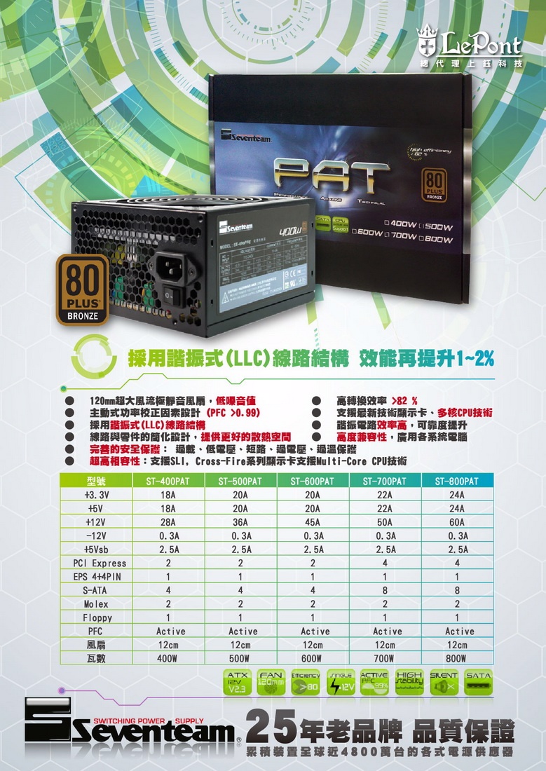 七盟 PAT 系列超強上市,通過82+銅牌認證,領先新世代 推出