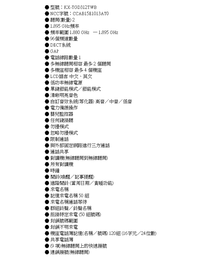 型號:Panasonic國際牌 DECT數位無線電話(KX-TGD312)黑色