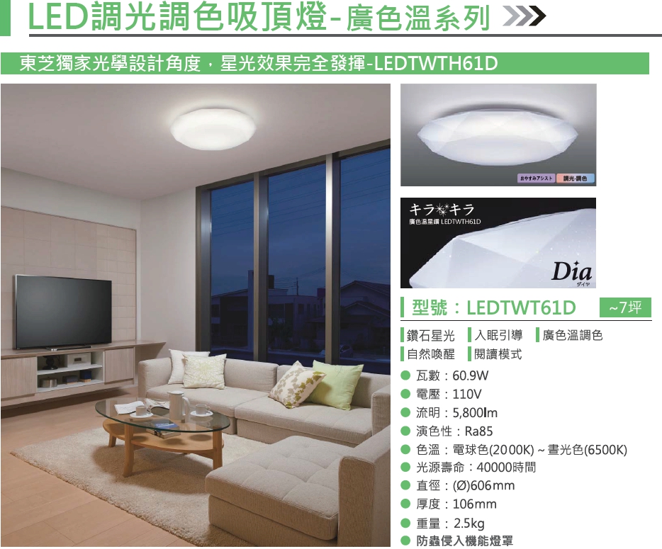 | 專案限量【Toshiba 東芝】LED60.9W 智慧調光調色 羅浮宮廣色溫吸頂燈 晶鑽版 LEDTWTH61D | ||||||||||