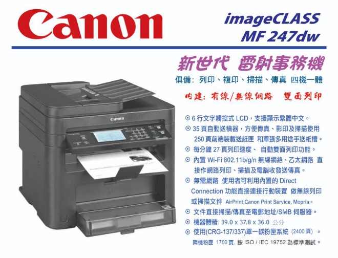 彩色雷射印表機-->CANON imageClass MF247DW黑白雷射多功能事務機商品查詢代碼:QK67497