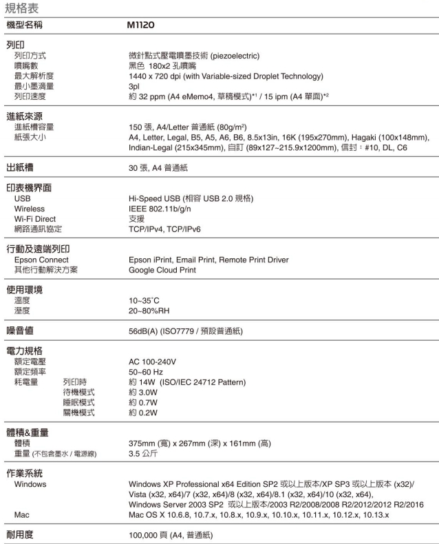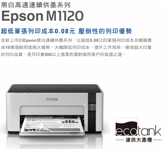 EPSON M1120 黑白高速WIFI連續供墨印表機 世界唯一 黑白連續供墨