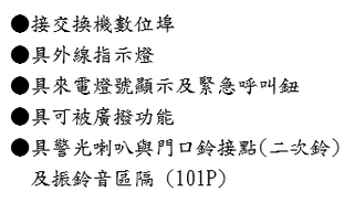急呼叫鈕、可被廣播功能。另具警光喇叭與門口鈴