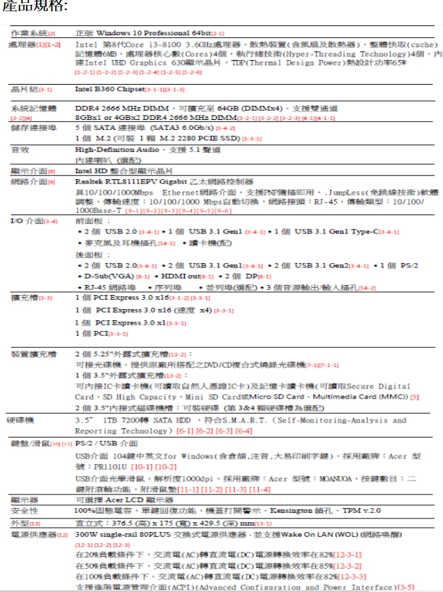 處理器 Intel 第8代Core i7-8700 3.2GHz處理器,散熱裝置(含風扇及散熱器),整體快取(cache)記憶體12MB,處理器核心數(Cores)6個,執行緒技術(Hyper-Threading Technology)12個,提供Turbo Boost(渦輪加速)Technology功能,內建Intel UHD Graphics 630顯示晶片,TDP(Thermal Design Power)熱設計功率65W