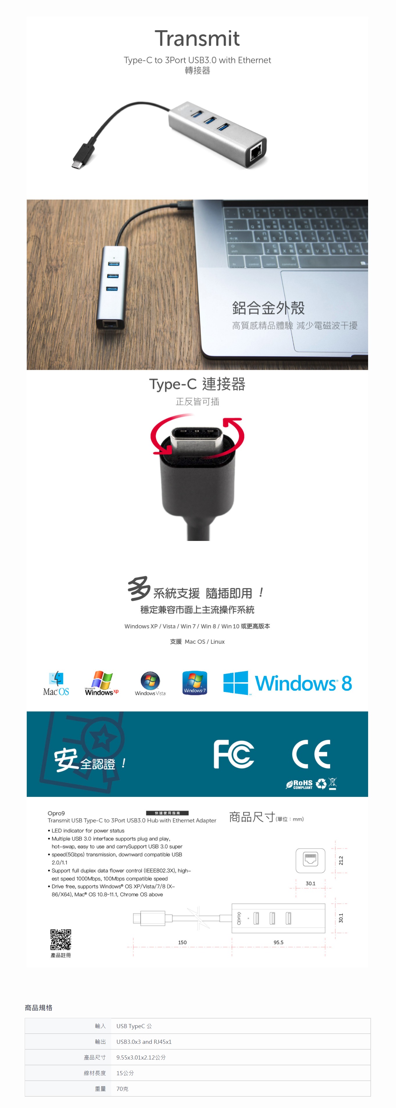 型號 :Opro9 USB-C 轉 3埠USB3.0+有線網卡 集線器