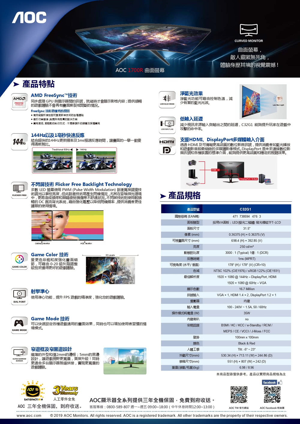 專案限量【AOC】C32G1 32型曲面液晶顯示器( AOC C32G1 )
